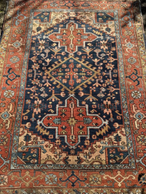 Antique Heriz rug, good condition, good colours, good size, unusual design 1.89m by 1.43m Contact gene@heritage-antique-rugs.com for more pics, price etc.