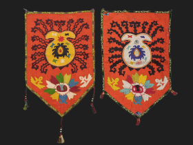 a pleasing pair of Antique Uzbek Lakai tribe Uut Kap Ilgich, silk on red mogul cotton, circa 1900.