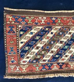 Akstafa Caucasian runner, fun thing in messed up condition with bad repair and some fuchsine dye. The other colors are vegetable dyes ... read more