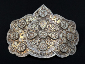 Kazakhstan ceremonial silver belt buckle. a nice hand made silver belt buckle with gilded background. It has great patina. Traditional spotted Kazak ... read more
