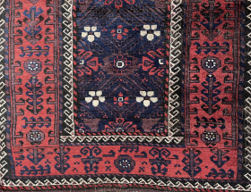 Lovely early fine Baluch rug. Just acquired locally. Attractive blue ground memling gul design. Delicate turkman line border. Decent condition for the ... read more