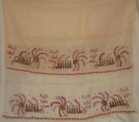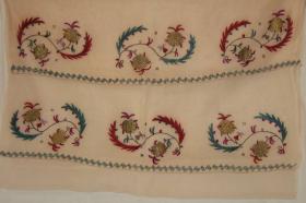 a phulkari chope, Western Punjab, c.1900. Floss-silk and cotton embroidery on red-dyed cotton cloth. 290 x184 cm. Chopes such as these feature stylized ... read more