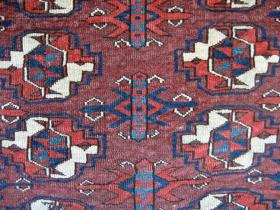 Early tekke main carpet fragment (cut and shut at top, missing 1 row of guls)with a rare elem, fantastic fine wool ... read more