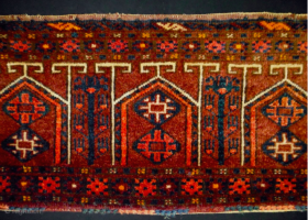 Unusual Baluch prayer rug with dark natural undyed camel wool and saturated natural dyes. An eccentric rendering of a classic design type ... read more