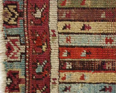 Old Turkish yastik with an interesting and colorful design. Overall very low pile with much foundation exposed. Original selvages. Ends unraveling. Selling "as found", very dirty. Looks like sulphonic blues but no synthetic. colors. 22" x 33"