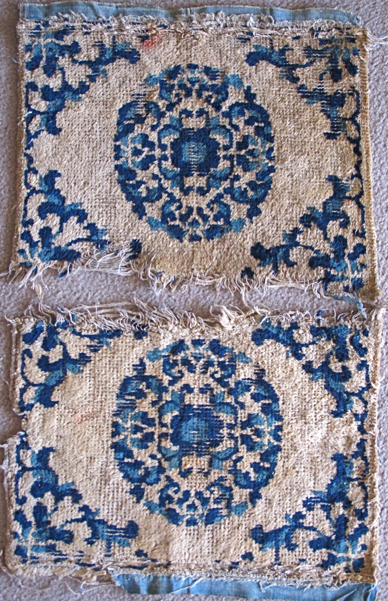 Pair of Small Chinese Ningxia Squares with Roundels. Almost dainty, nicely drawn with two blues. Warp is hand-spun cotton. Weft is a combination of hand-spun cotton and wool. (Each square measures apx. 18"x14" / 45x35cm