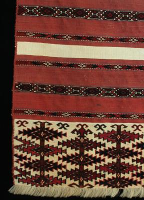 Tekee Ak Chuval. Ex. Blau collection. Second half of the 19th century. Finely knotted textile. With small repair in field, can be seen in main image in the central strip just left of center. Otherwise in excellent condition. White in the piece is cotton. 28 1/2"x44 1/2". Please take the time to view the other items in my inventory. Thank you.