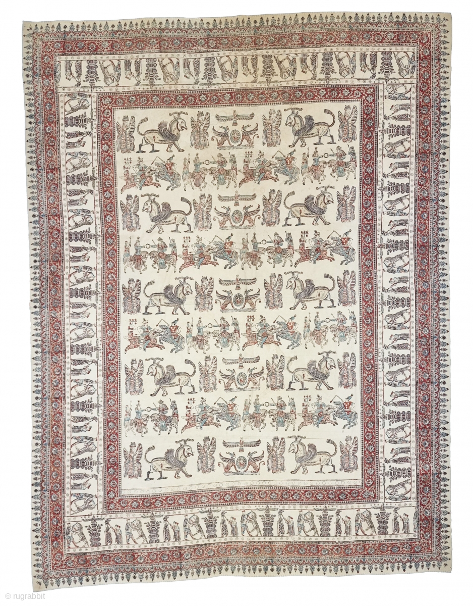 Several royal figures of all types of occupations and garbs are featured interacting with each other. Alongside these figures are numerous mythological beasts, The mythological scene. This gorgeous Persian textile reflects the Zoroastrian roots of Persian culture. It also features some of the most iconic elements of ancient Persian culture and mythology with Stamp on it.