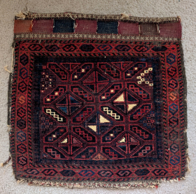 • Baluch double-sided sumak salt bag with a design seemingly derived from a Turkmen tentband, one side more worn than the other, still ... read more