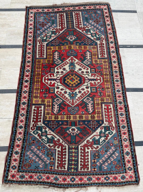 This circa 1860 antique Caucasian Borchalou Kazak rug measures 5’4” x 7”. It is a nice big Kazak and the only prayer ... read more
