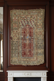 This circa 1825 Melas or Melez antique Oriental carpet measures 3’8” x 4’10”(115 x 152 cm). It has a tomato red prayer ... read more