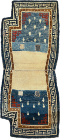 Tibetan under saddle carpet (makden) from the 1800’s / 19th century with the so-called ‘frog-foot’ motif scattered sparingly throughout the main field, ... read more