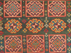 Genje green ground rug, 19th century. Wonderful large florets and hooked medallions in the field. Some old repairs here and there. ... read more