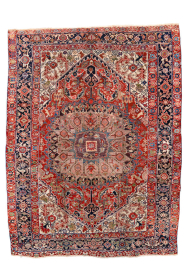 Antique Persian Serapi Carpet, circa 1900. Featuring a bold geometric medallion on a warm rust field with soft blue and ivory accents, ... read more