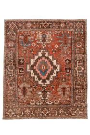 Antique Persian Heriz Rug, circa 1900. Featuring a bold geometric medallion on a vibrant red field with deep indigo and ivory accents, ... read more