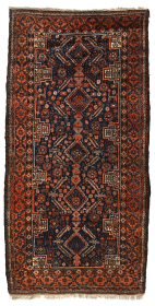 Antique Baluch (Timuri? Salor Khani?) small 5-medallion rug, 38 x 74 inches, very good condition. Second medallion from top contains a Vajra-like ... read more