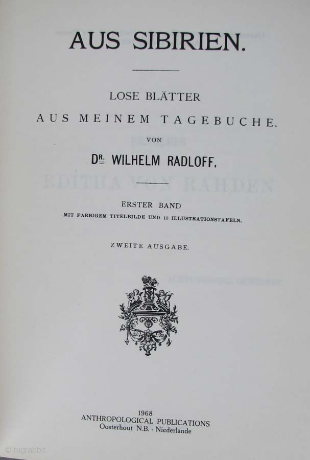 13. Radloff, Wilhelm, Aus Sibirien, Anthropological Publications, 1968. Photomechanical reprint of Radloff's 1898 account of his travels and work in Siberia, an important work. In German. Excellent condition apart from a few minor nicks on the hardcover and one tear on a illustration plate (not into image), no dust jacket, two volumes bound as one, 534 + 486 pages, 31 plates with illustrations, map, 5.5 x 7.75 inches.