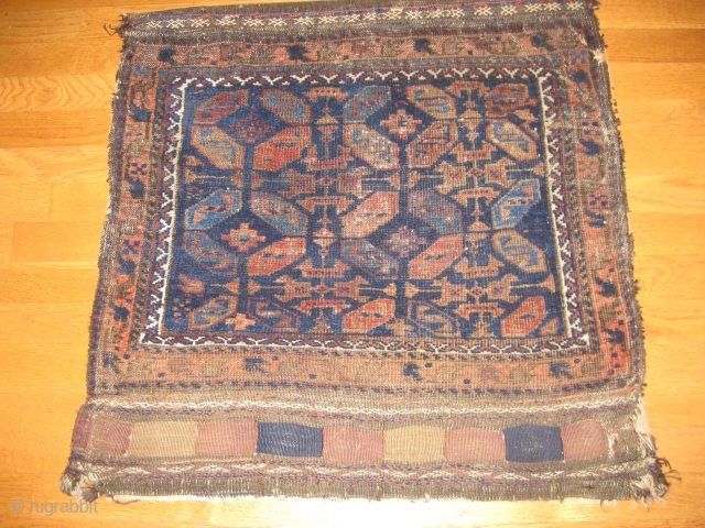19th c. Belouch Bagface with good medium soft pile. Outstanding blues. Some oxidation of brown. Complete, striped kilim backing attached. Archaic design. Size 28 x 27 inches when closed. Retains a few of the loops for closing.