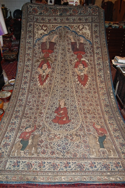 19th Century Kalamkari Textile, Persia, ONe of the most beautiful pieces, big size about 4 Meters long and 1.5 meters Large, The piece long ago was put on a cotton back, the condition is quite good for its age, as seen in the picture in some areas the textile has suffered little but it takes nothing away from the beauty og the piece, singed and datted.