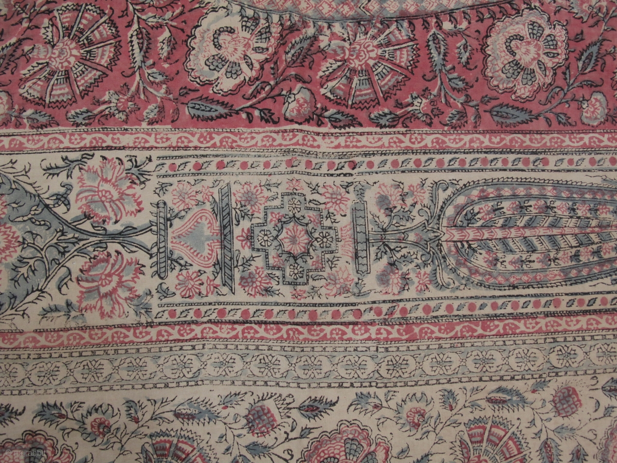 a 19th century kalamkari block print. Measured approx. 2x4 meters. It's huge and magnificent as a feast of the eyes. It has a good patina with subdue color scheme. Motives constitute of two main cypresses in the niche framed by series of elaborate floral vines and smaller niches with cypress on both side. The bottom part has what looked like geometric motif arranged in pyramid shape flanked by tiger chasing deer scene. At the very bottom part lines a row of soldiers riding on the horseback. Suspected to come from the aristocrat household in India and must have been used for wall hanging decoration. Already mounted on the cotton backing, ready to be hung on display. Very well kept comdition considering it age and size, despite some minor holes and torns