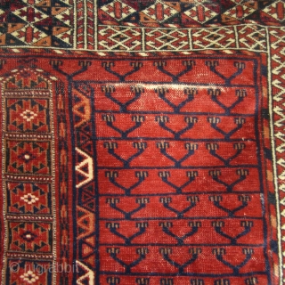 This 19th century Tekke Turkoman tent opening cover could use some work as it does not lay flat. It also has some areas of low pile (see detail photos) Other than that, it is in very good and tight condition for its age and is still very beautiful.