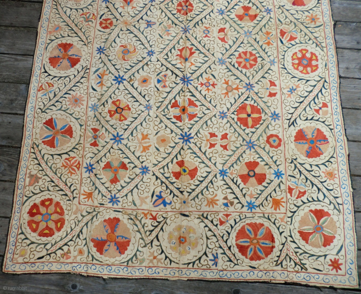 The ground of this suzani is made from five handwoven panels of cotton and the embroidery is silk in all natural colors. All embroidery is done in chain stitch. This suzani is backed with hand woven cotton which is block printed (see photos 8, 11 and 12). In addition, all edges have a silk ikat piping. The condition is is excellent - all original with no fading, no holes, tears or repairs with no losses to the edges or corners. There is some minor loss of embroidery in some areas in only the single lines of chain stitch (example seen in photo 10), but none in the larger elements. The silk ikat piping is partly worn out (see photo 8) and there are a few small stains (see photo 9).