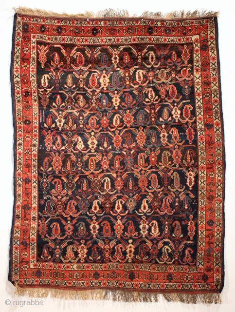 Antique Afshar rug with classic design and good "as found" New England house condition. Good meaty pile with all natural colors. All wool. a couple of spots needing easy repair (now crudely backed). Sides rewrapped. Reasonably clean. Good late 19th c example of the type. 4' x 5" 2"