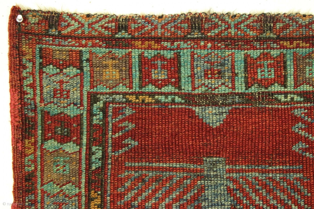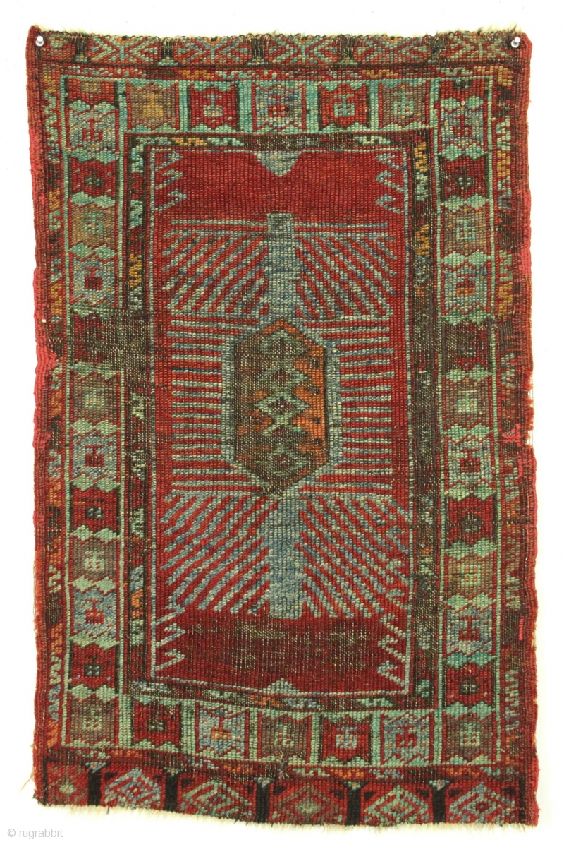 Antique Anatolian Yastik. Bold and unusual design. All natural colors. Old condition as shown. Thin with wear and oxidised browns. Minimal side edge repairs. Reasonably clean. Good age ca. 1880 or earlier. 2' x 3'