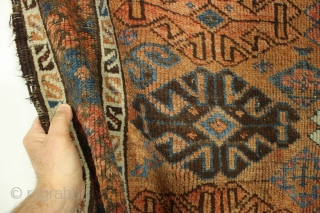 Antique baluch rug. Turkish knotted. Nice large scale design. Fair condition. Very very dirty but looks to have all good colors, should wash up nicely. Late 19th c. weaving 3' 3" x 5' 2"