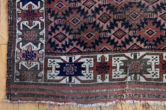 Antique Baluch rug. Unusual ivory border. Mostly good even low pile. Couple tiny holes. Original ends and sides. Clean. 3' 7" x 5' 9"