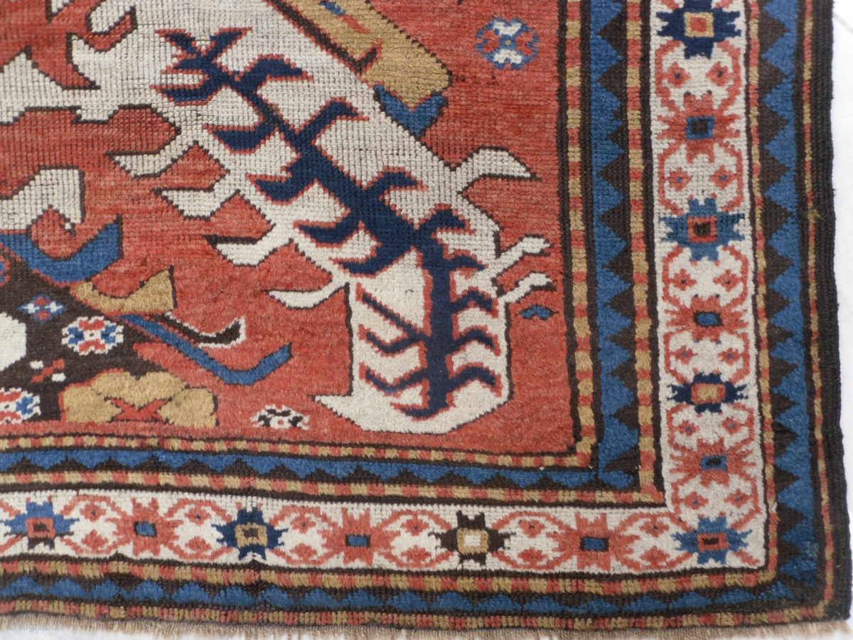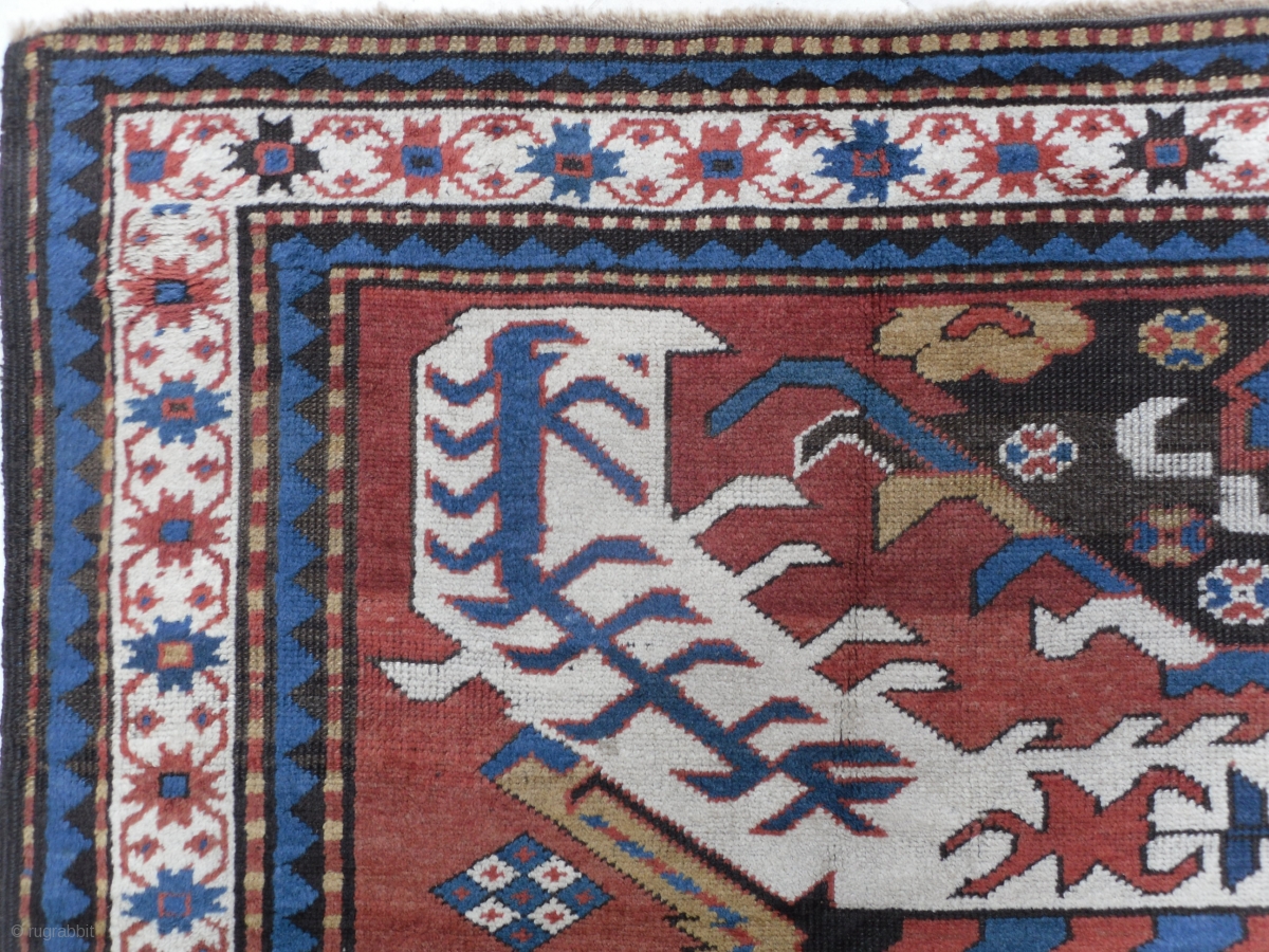 Antique Caucasian Chelaberd (so called Eagle Kazak) Rug from Karabagh, 6.9 x 5.5 ft, rare single medallion design, very good condition with near full pile, one small old crease repair in the right side of the medallion visible on the back, no other repairs or issues. 19th century.