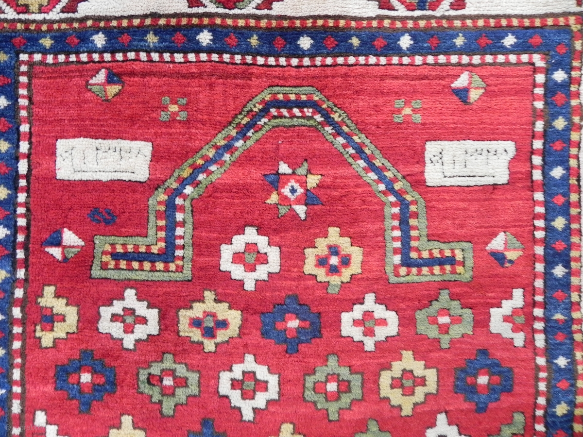 Antique Caucasian Fachralo Kazak Prayer Rug, Dated 1328 (1910 ad), a top of the shelf collector`s rug in German condition.