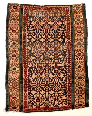 Antique caucasian Konaghend rug. Highest quality weaving. Possibly attacked by wolves. Thick glossy high pile but both end borders damaged. Numerous scattered chewed spots very crudely "repaired". All is not lost as the rug is quite clean. Not rotten. All vibrant natural colors and fantastic lustrous wool. If only a rug could speak. Ca. 1880 or earlier. 3' 10" x 4' 11"