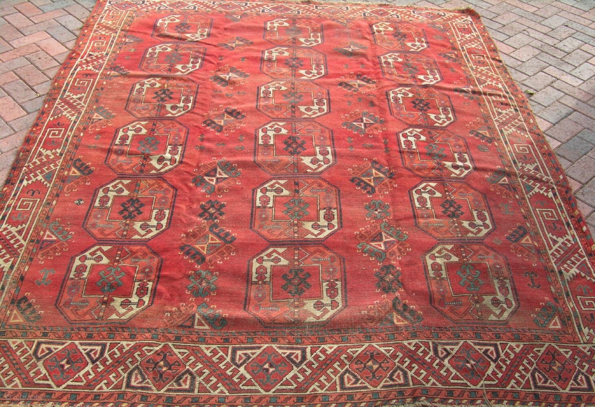 An antique Ersari carpet with lovely ground color, good spacing and a border normaly associated with early Tekke main's. Some wear, totaly market fresh, untouched and filthy dirty. 10x7. 19th century.