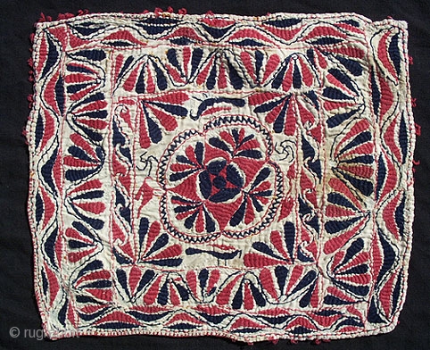 Antique Indian Kantha Embroidery. Fine small antique Kantha Embroidery coverlet that was may have once been used as a dowry or gift bag but has been opened to form a square coverlet, 12 x 12 inches. The West Bengal region of India is known for its fine Kantha work made from cotton cloth that is quilted and embroidered with cotton thread and running stitch. This is a wonderful and lively late 19th century embroidery in red, dark blue and light blue floss. Stitches are extremely fine and evidence of the skill of the embroidery. The condition is goodexcept for a few tiny pinpoint holes and a small stain new top (see photo).