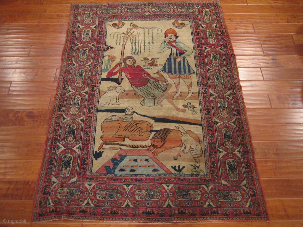 Antique Kerman? maybe Isfahan? Its in good original condition. Awesome courting scene and wild animals. This magic carpet measures 4'4'' x 6'4''.