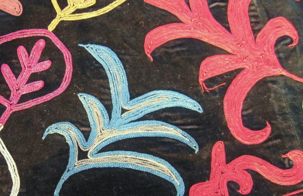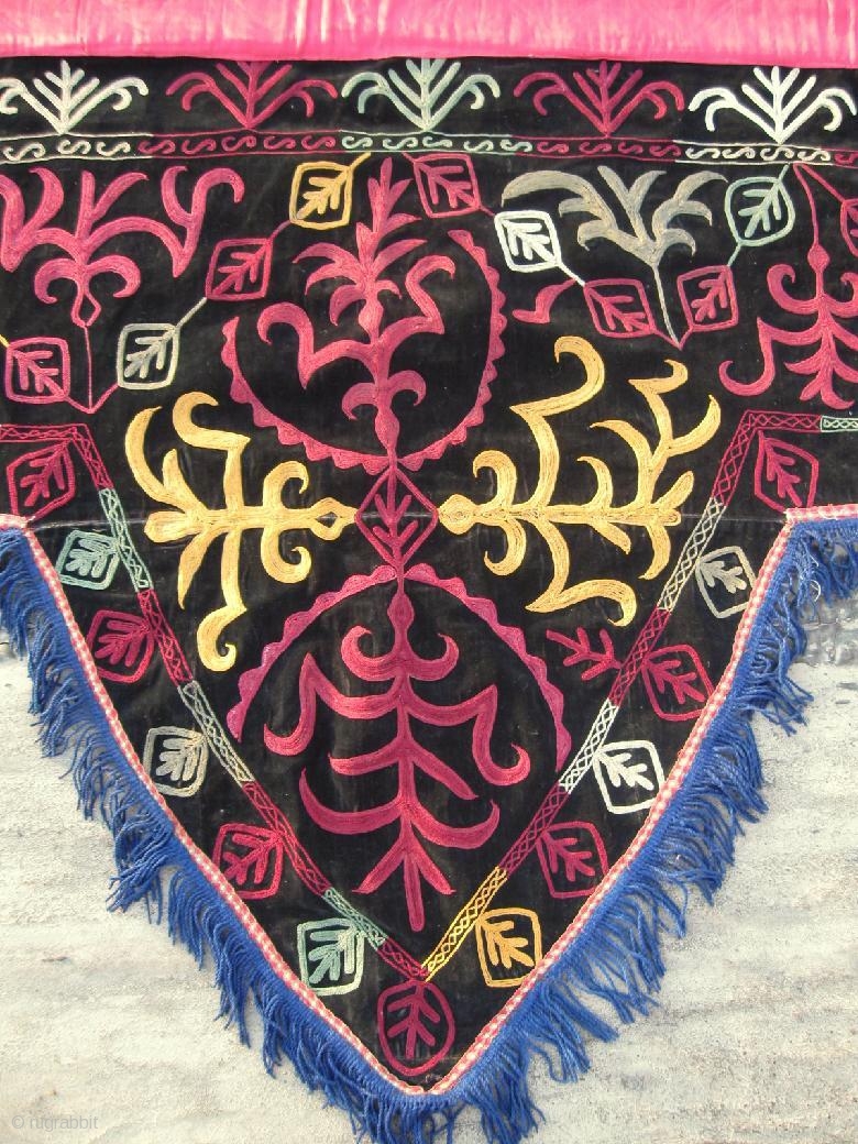 Antique Kirghiz nomads large wedding tent decoration, Central Asia, silk embroidered on black silk velvet, have nice colors. Circa 1900. In excellent condition. The fringe not so old, was added after. Size is 350-180 cm, 11'8" x 6'.