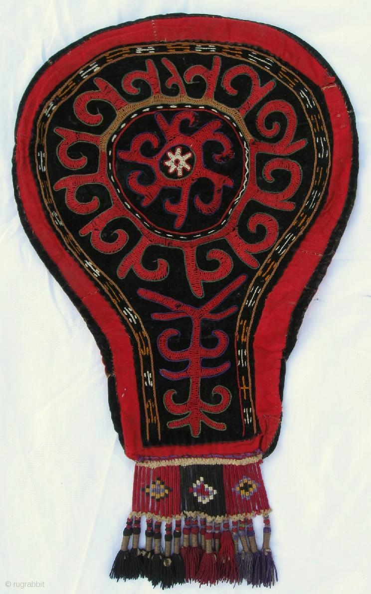Antique Kirghiz nomads tent decoration, Central Asia, silk embroidered on black velvet foundation, have a very fine fringe, circa 1900. Size is 22x13 inches, 55 x 33 cm with fringe.