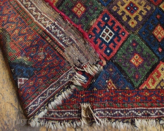 Antique Kurdish bagface. Excellent natural colors including a fine purple and a very good yellow. Rough condition. ca. 1880 2"1" x 3'