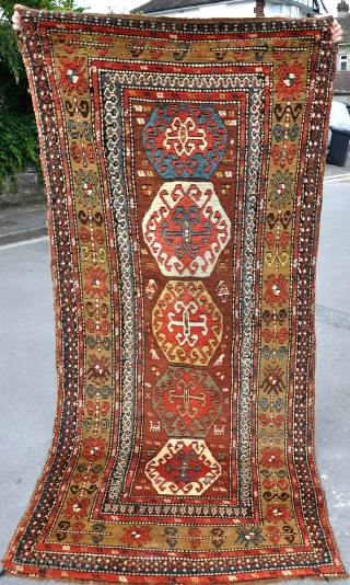 An antique Kurdish rug with good dyes in full pile. The design is clearly based on an early Borjalu kazak. One or two small holes, needs a wash. wool on wool. late 19th century. 250cm x 120cm