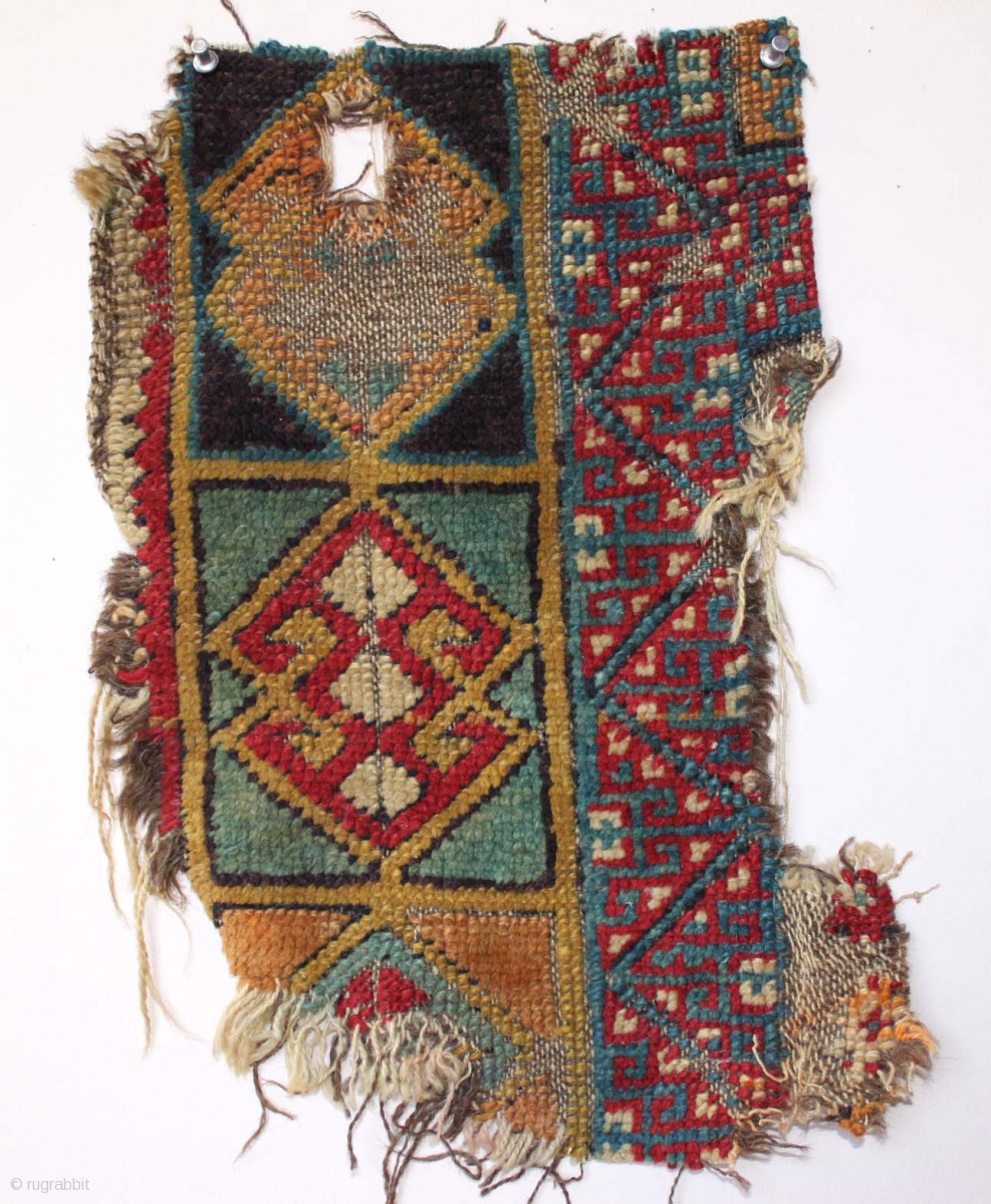 Antique Turkish rug fragment. Nice colors. Deep purple and rich green. Old. 12" x 17"