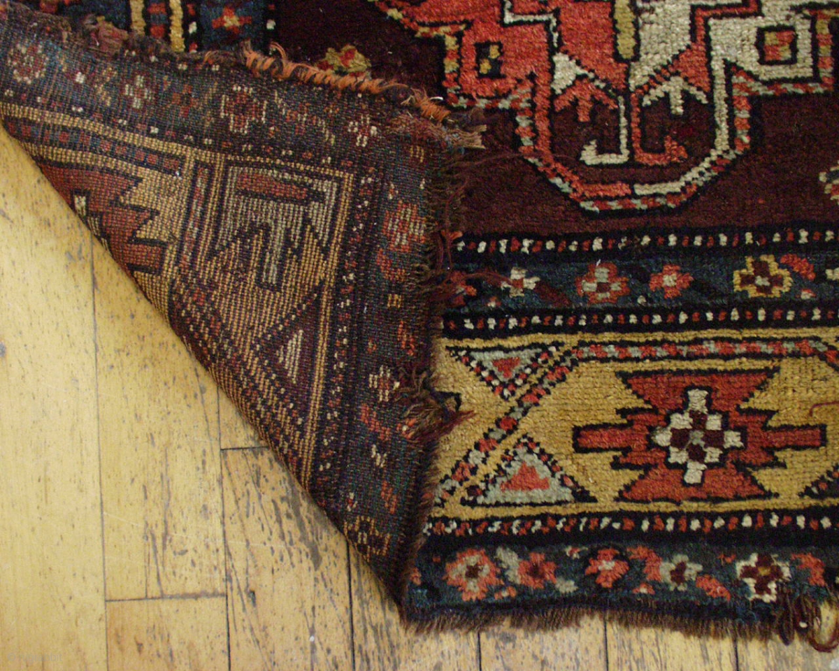 antique veramin long rug. nice design. mostly good pile. all natural colors featuring pretty light blues. some scattered wear, rough ends and edges, old moth nibbles. just washed. restorable. 19th c. rug. measures 3' 5" x 9' 11"
