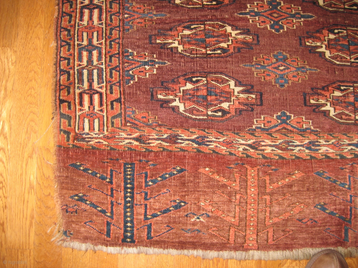 Antique Yomud chuval, 19th c. w/soft medium pile. Missing side cords but good overall condition. Unique alem motif. Size 4'4"x 2'7"