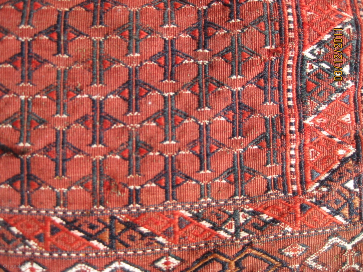 Antique Yomud sumac double bag, ca 1900. Complete with kilim backing. Good condition and with fastening loops intact. 42 x 20 in./107 x 51 cm. All natural dyes. Washed.