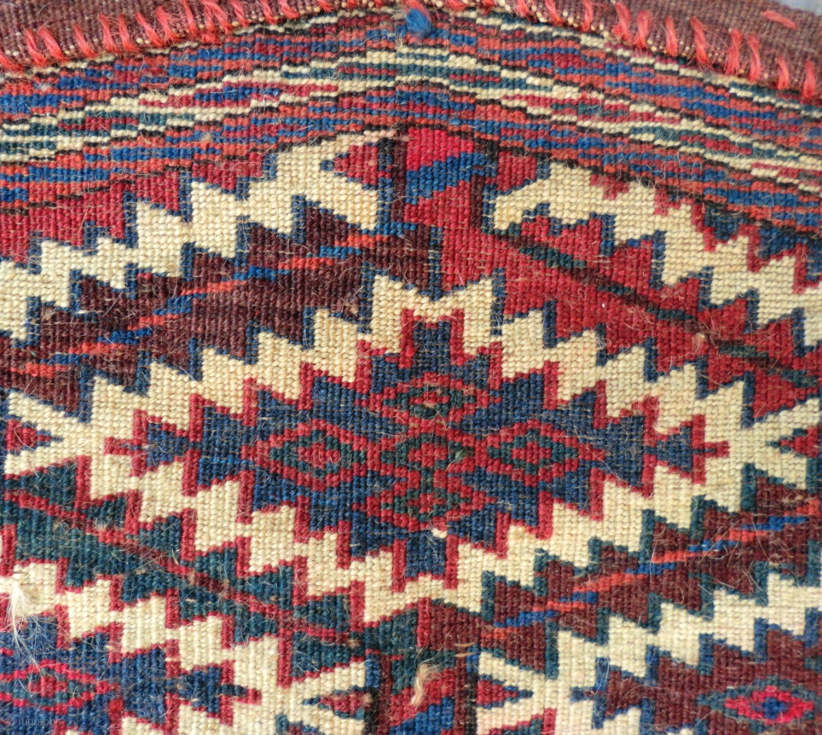 This five-sided Turkoman bridal trapping is truly a collector's item with real investment value. a rarity in the antique textile trade, it is especially hard to find in near mint condition with all its tassels and ties still complete. This asmalik has full pile and shows no wear. The only flaw i could find is a very small group of three spots where some pile is missing. The largest of the spots is about 1/2 cm in diameter (see photos 10, 11 and 12) If you examine these 3 photos closely you will see little flecks of white on the surface of the pile. They are only on the surface and feel like dried paint. i did not try to remove them since i have no expertise in rug cleaning. This flaw is only in a very small area and i am certain it can easily be taken care of.