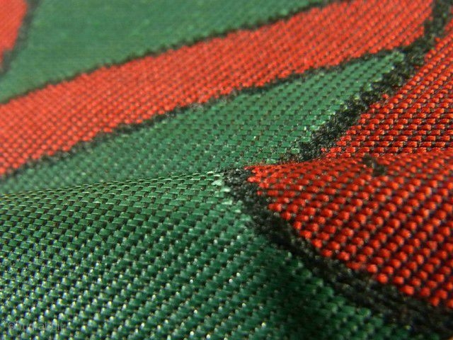‘Art Nouveau’ silk urushi Obi, Japan, Showa (circa 1940), cm 353x31. The ‘obi’ is a sash for traditional Japanese dresses, and a part of kimono outfits. This one is a so-called ‘nagoya obi’, an asymmetrical shaped, shorted than usual obi that was mostly used by young, unmarried women. Out of the ordinary, though, is the ‘floral’ pattern and its colours decorating this smart sash. Woven on a rich moss green silk ground, the vivid red floral pattern (much resembling those of French Art Nouveau or, better, those of Viennese Jugendstil), with its ‘urushi’ outlines makes the obi almost glowing, and definitively trumpets a strong visual statement on its own. Very recommended…….