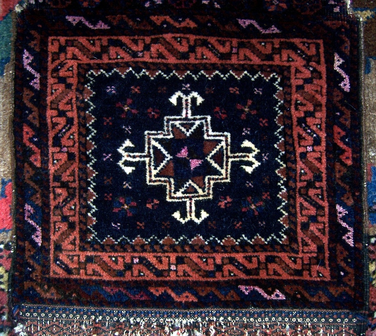 Baluch khorjin. Saturated colors and complex kelim ends. Ends and edges of bridge part have wear, but full pile otherwise.