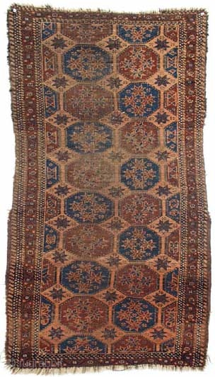 Baluch Rug, 19th Century, 52 x 30 inches, Inv# 1457 ------- Interesting and rare design and palette. Low in the middle, sides chewed up, all vegetal dyes, nice wool.
