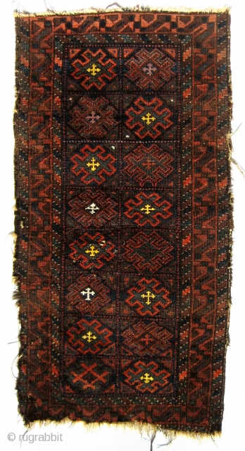 Belouch Bag Face, 1'9 x 3'4. Desirable compartmented design compares favorably to Plate 53 in Jeff Boucher, Baluchi Woven Treasures. Note the added crosses, the sileh dragon border, the abundant green and Chodor purple. The gold crosses are silk, the white ones are cotton. Fresh find. (Inventory Number 377.) Specially priced for RugRabbit.com...