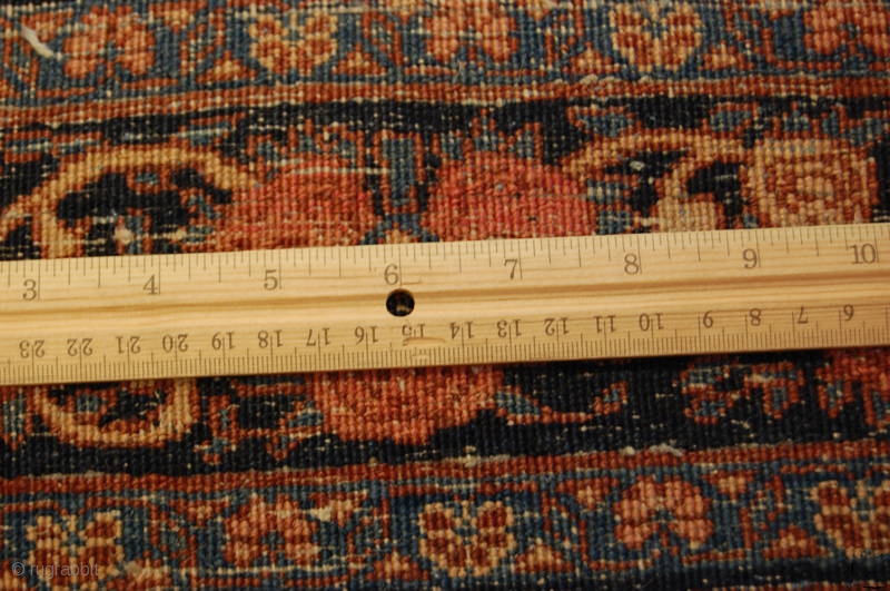 Bidjar Runner, ca. 1920, 3'4" x 8'9". Wool pile on cotton foundation; 252 symmetric knots per square inch (14 x 18). Almost certainly a custom order by an astute dealer; why else the high knot count for a simple open field runner? Fine condition. Beautiful natural colors. Note the incredibly refined gol farangi border system. Clean, no splits, no hardness, no cracking. Fresh find. (Inventory Number 421.)